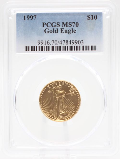 We have plenty of numismatic gold coins available, from the smallest .10 oz Gold Eagles to full 1 oz. Gold Eagles, and in numerous denominations and years. We typically sell .10 oz, .25 oz, .50 oz, and 1 oz sets or years-ranging sets. For example, one popular option is our 1988-2021 NGC PF70 $50 Gold American Eagle Collection.