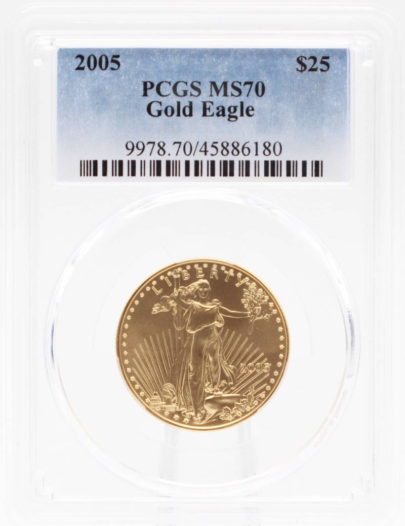 This year marked the nineteenth year of production for the Gold Eagle series. In 2005 the United States mint struck just over 80,000 one-half ounce Gold American Eagles which represented nearly a 20% drop in production when compared to the previous year. Less than 2% of the coins struck received the perfect grade of MS70 by PCGS. This is a beautiful example of a 2005 $25 Gold Eagle. The detail, strike, and luster on this piece are absolutely pristine. The intricate detail and clarity combined with the amazing luster will make this flawless Gold Eagle appealing to both collectors and investors.
